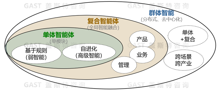 汽車產業(yè)充分體現(xiàn)了這一演進路徑,當前各域部分正處于向單體智能體轉型階段;繼而通過產品、業(yè)務、管理多線智能演化,使單智能體復合成整車和企業(yè)智能體;最終構建企業(yè)內外部智能體協(xié)同交互的群體生態(tài)。