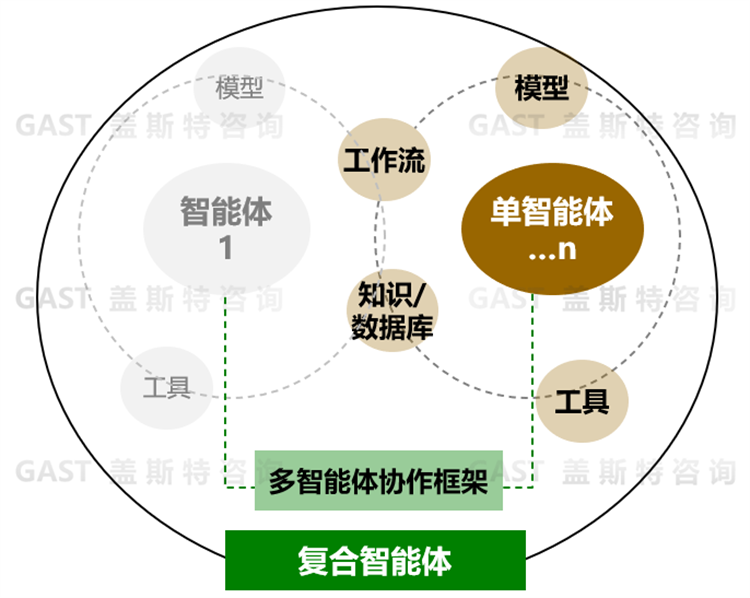 當多個單智能體通過多智能體協(xié)作框架集成時,便形成復合智能體的系統(tǒng)性能力。多智能體協(xié)作框架作為復合智能體的構建核心,需保障任務銜接和信息傳遞準確。首先作為任務銜接中樞,基于大模型動態(tài)任務分解功能實現(xiàn)子任務分配與跨智能體調度;其次作為工作流對接引擎,確保多智能體工作流無縫銜接;最終建立統(tǒng)一通信協(xié)議,以標準化數(shù)據(jù)接口與知識庫共同語義框架消除交互歧義。