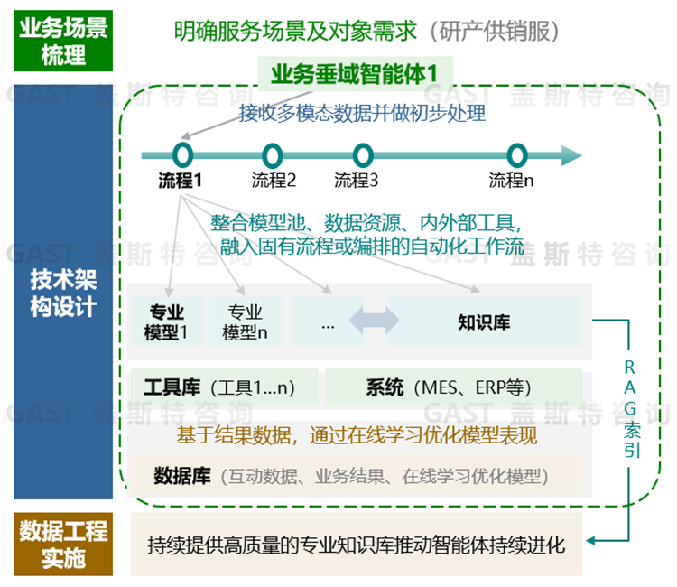 在策略實施層面,基于技術能力與業(yè)務需求結合、近期目標與遠期規(guī)劃結合的原則。短期從重復性強、流程成熟、知識沉淀足的領域切入;長期則構建覆蓋研產供銷服等的全業(yè)務復合智能體,實現(xiàn)從單點突破到全局智能的以點帶面的階段性實施。